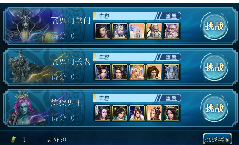 在首领挑战中,各位剑仙可以使用3队散仙挑战3个首领敌人,在3场挑战中,使用的散仙不可重复。每场挑战胜利后,根据使用的行动数获得对应的积分,使用的行动数越少,获得的积分越高